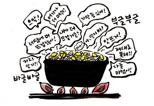 아침에 일어나 일기를 쓰다가 문득 콩나물을 그리기 시작했다. 언젠가부터 콩나물에 감정이입을 하고 있었다. 큰 조직의 일원으로 살다보니 콩나물국밥 속의 콩나물 한 가닥이 된 듯했다. 뚝배기에 왕창 모여 팔팔 끓다보니 자꾸 부딪치고 아우성치게 된다. 그 와중에 위에서는 자꾸 고춧가루가 쏟아지고 숟가락이 날아든다. 과로와 갈등과 공격이 끊이지 않는, 이곳이 바로 지옥탕일까?