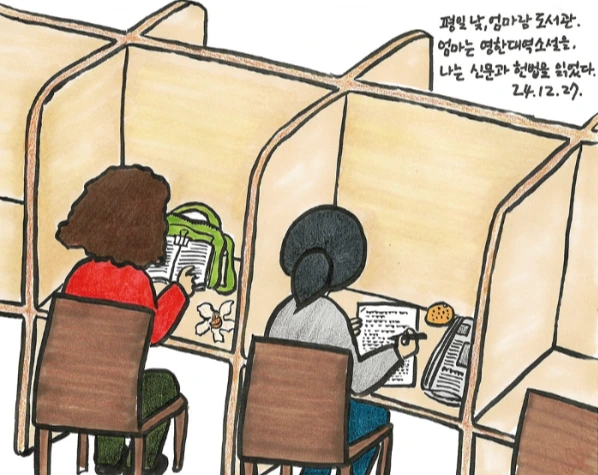 그 뒤로도 본가에 내려갈 때면 종종 엄마와 도서관에 간다. 평일 오전의 도서관에는 사람이 별로 없다. 조용한 열람실에서 나란히 앉아 책을 읽다 보면, 엄마는 “껌 주래?”, “귤 주래?” 하며 없는 게 없는 가방에서 간식을 꺼내 준다. 정오 무렵이 되면 햇볕이 지나치게 잘 드는 휴게실에서 간단한 점심을 먹는다. 집에 오다가 마트에 들러 장을 보기도 한다. 어릴 적의 도서관 소풍을 생각하면 지난 30년이 아득하게 느껴진다. 엄마와 내가 이렇게 나이를 먹었다는 게 믿기지 않는다.