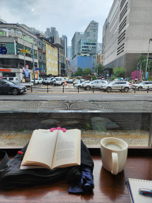 1327. 괜찮아! 점잖아질 수도 있지! 뭐 어때? 쓰는 사람이라면 이런 것도 마땅히 감당해야 할 감정이 아닐까? 책도 다 읽었고 카페도 점점 붐비고 비도 그쳤는데 나가볼까. (이때 읽은 책은 [책방이 싫어질 때])