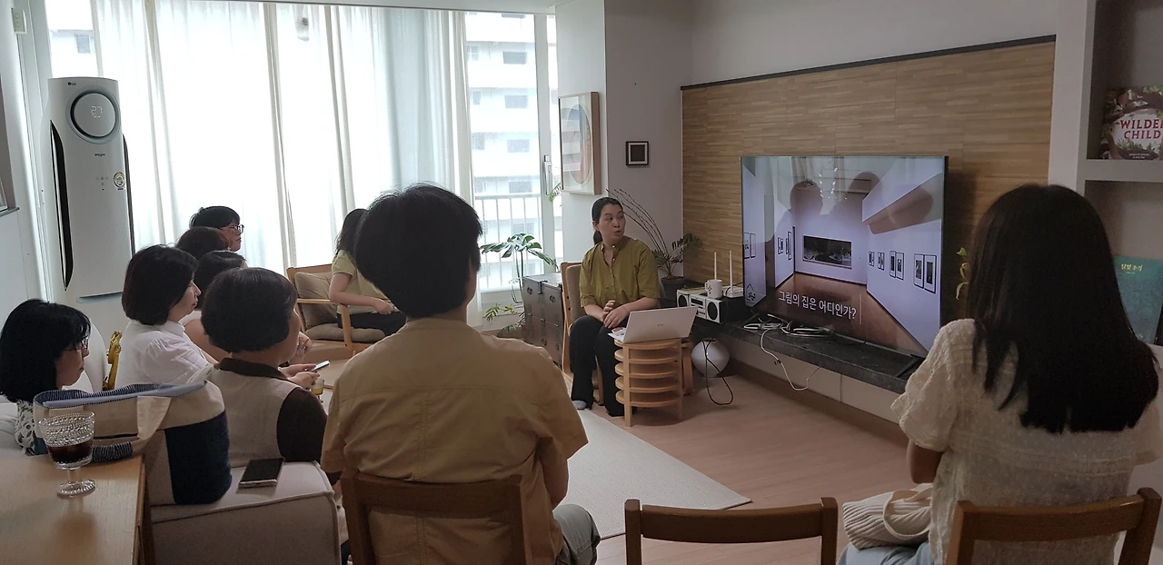 모두가 집에 은둔하던 코로나 시절 좋아하는 그림책 작가와 SNS로 소통하던 그녀는 작가의 그림 전시를 집에서 해볼 궁리를 한다. 그림이 걸리는 목적지는 미술관이 아니라 결국 집이라는 생각을 가진 강언덕에게 집은 정말 좋은 전시장이 될 수 있을 것만 같았다. 모두가 집의 문을 닫아걸 때, 오히려 문을 열기로 한 그녀의 이런 발상에 나는 정말 놀랐다.