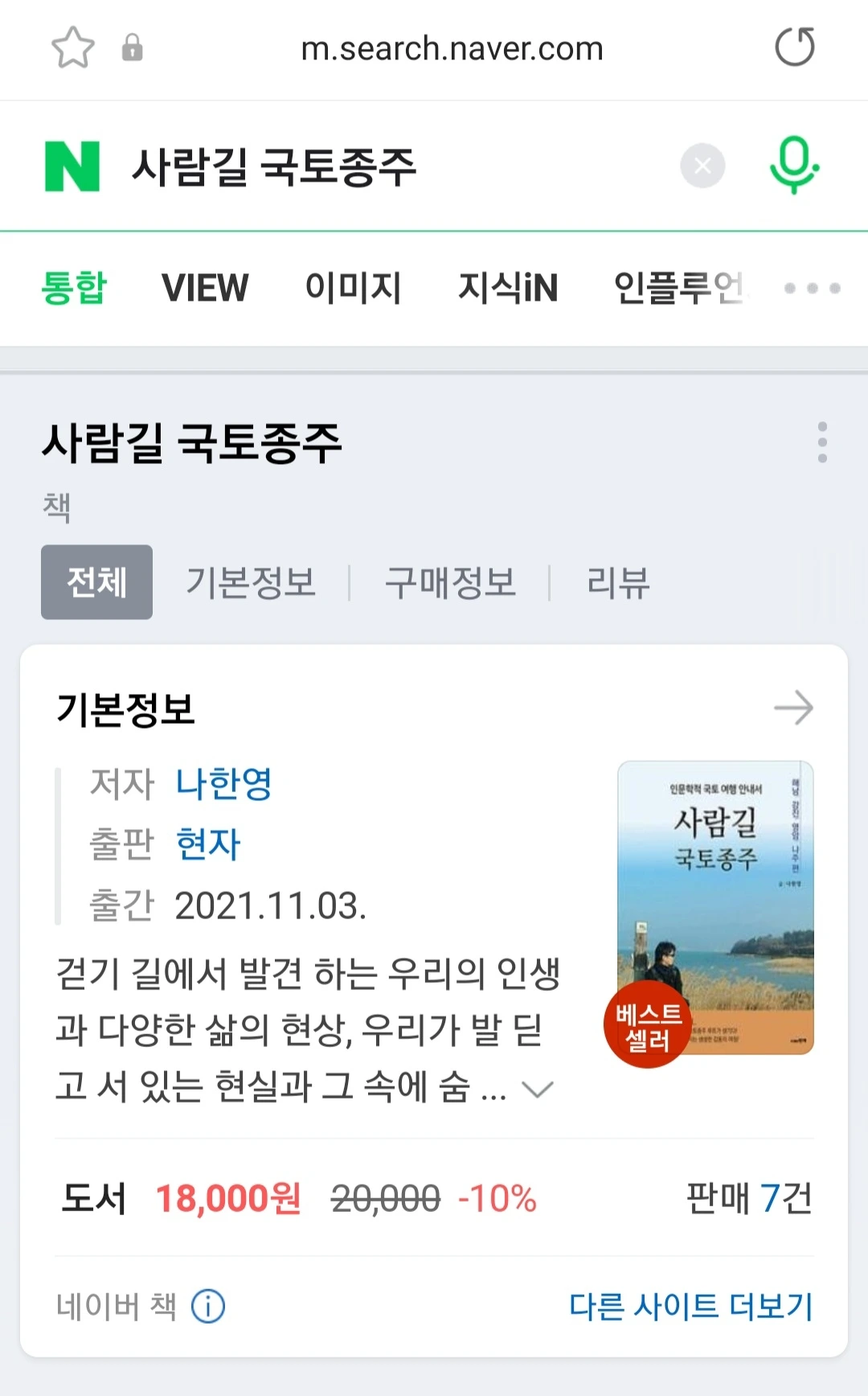 그제(11.16.) 네이버에서 내 책을 검색해 보니 '베스트셀러'라는 붉은 표시가 선명하다. 어! 이게 머지? 네이버 규정을 알아보니 어느 한 곳이 아니라 여러 판매처의 판매량을 총 집계한 결과치라고 한다. 사실 난 놀랍다. 대체 누가 이렇게도 꾸준히 사는 것일까. 물론 책을 직접 쓴 저자로서 누구에게나 추천하고 싶은 책이지만 사람들이 어떻게 알고 이렇게나 많이 구매하는지 놀라울 뿐이다. 아무튼 베스트셀러라는데 힘을 얻어 직접 <사람길 국토종주>를 소개해 본다.