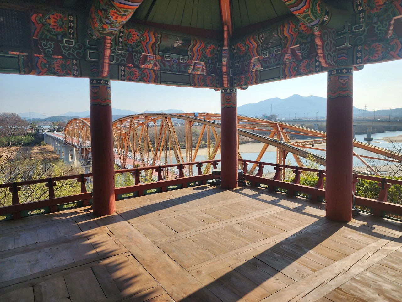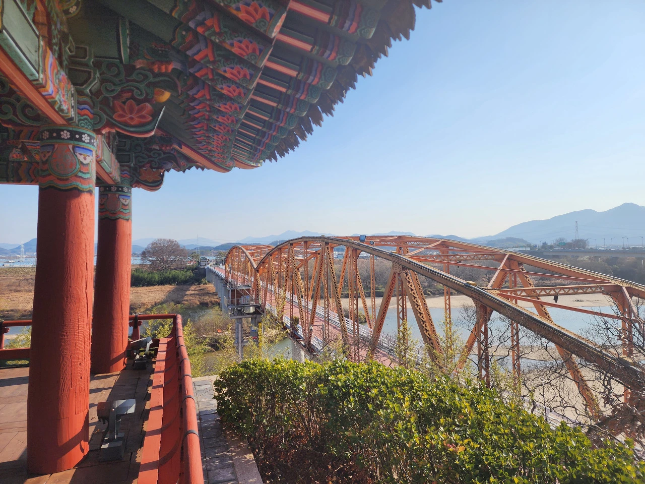 정암루 바로 오른쪽 밑으로 유려한 정암철교가 남강을 건너 뻗어있다.