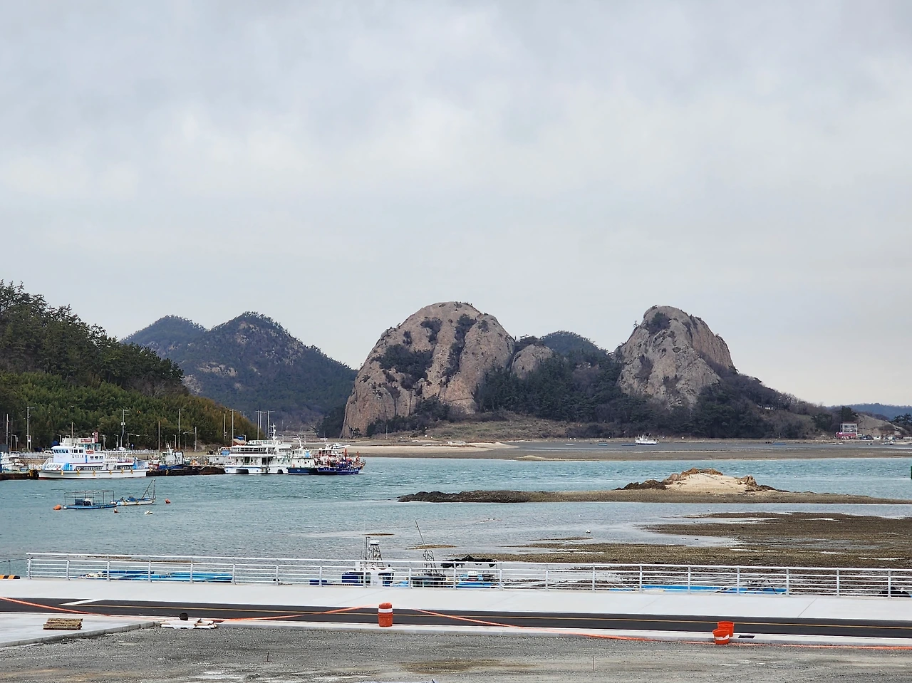 물 때를 맞춰 가면 쥐똥섬에 들어가 볼 수 있다.(좌) 무녀도 조망정차대에서 계단을 내려가면 선유도 선착장과 망주봉이 함께 조망된다.(좌)