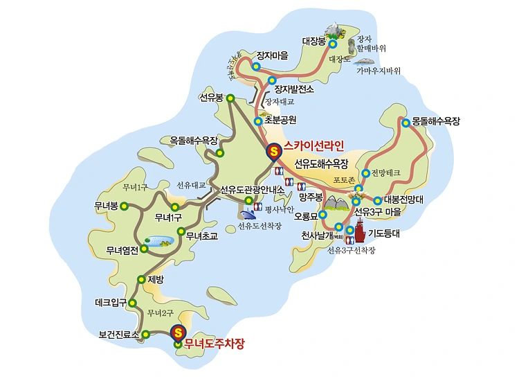 선유스카이 SUN라인(짚라인) 위치에서 시작해 망주봉 앞길로 천사날개벽화를 지나 선유 3구 마을 골목을 누비고, 기도등대와 대봉전망대, 몽돌해수욕장, 명사십리해변의 풍광과 벗한 뒤 선유스카이 SUN라인으로 돌아와 인도교인 구장자교를 건너 장자교와 대장도까지 걸어갈 수 있는 코스가 구불 8길 A코스(12.4km)이다.
