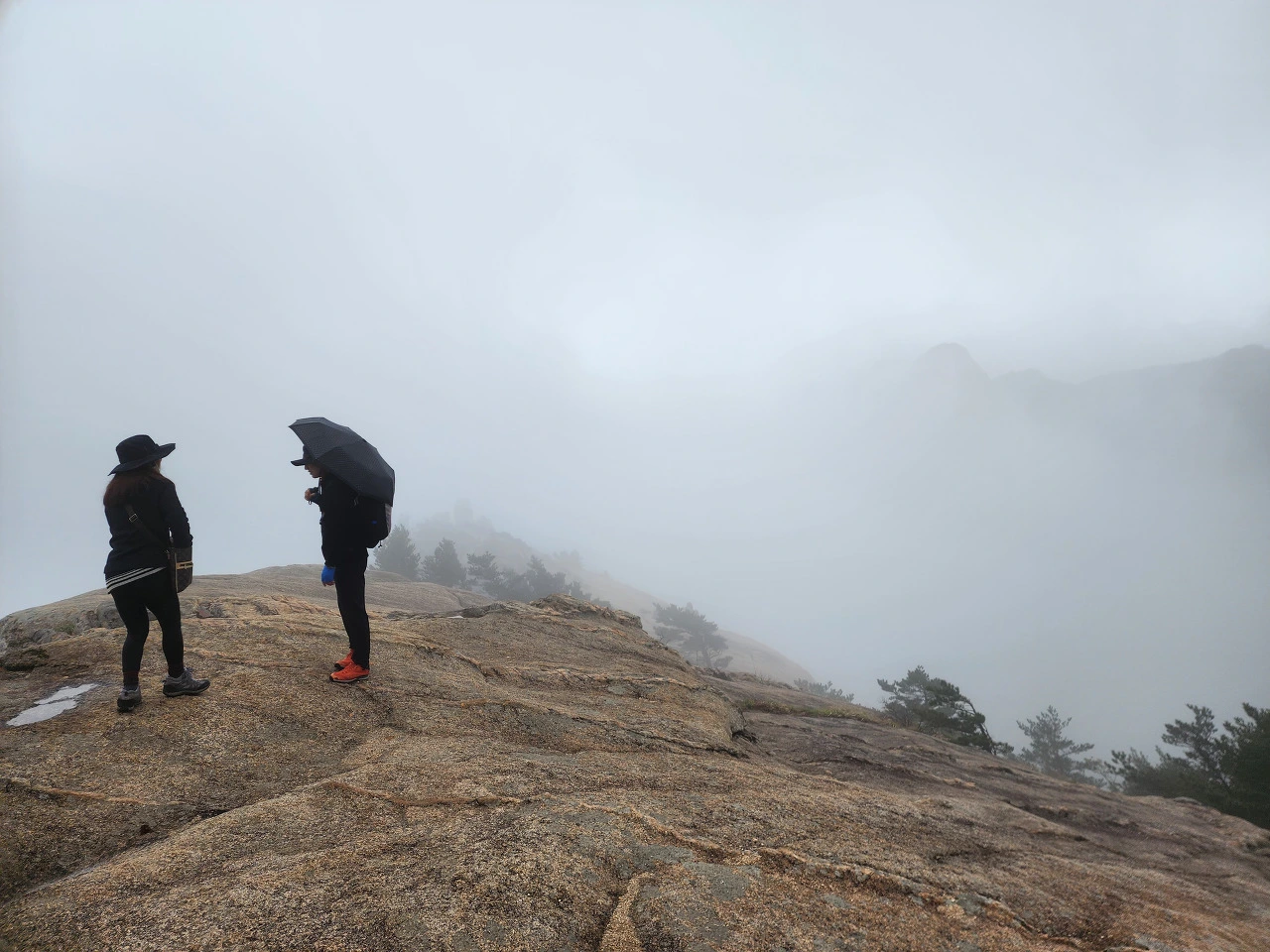 드디어 화암사 전망바위에 도착했다. 그림 같은 동해안의 절경을 감상할 수 있다는 바위라 잔뜩 기대를 안고 올랐는데 온통 안개가 꽉 차 바위 외엔 세상이 모두 하얗다. 가슴이 철렁한다. 오늘 신선대에서 울산바위를 마주하려던 기대가 무너진다.