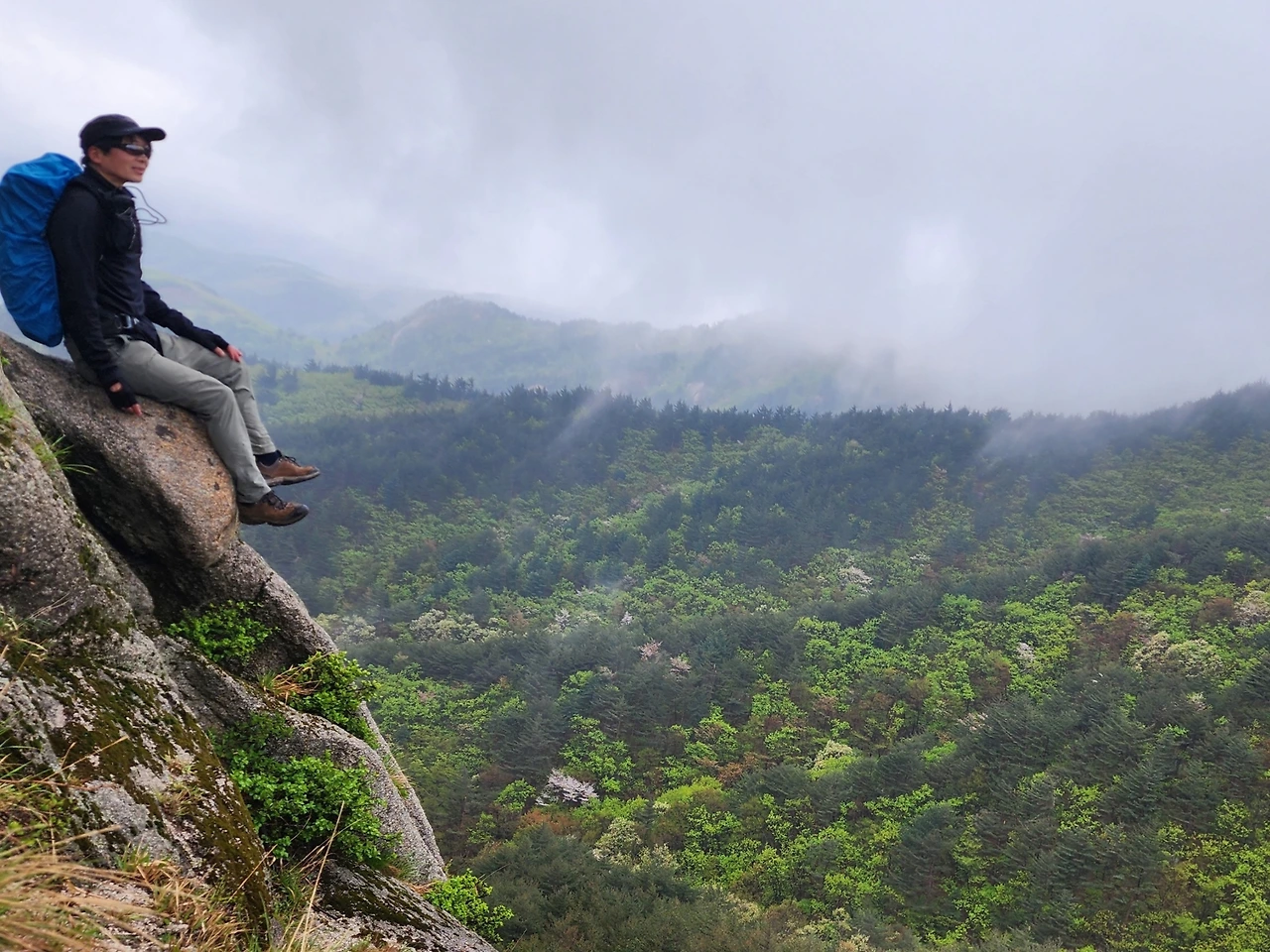 앞서 지나갔던 4명이 우비를 꺼내다 환호성을 지르며 한 명 한 명 신선대 절벽 위에 서서 사진 찍기에 바쁘다. 나는 셀카로 만족하다가 그분들의 사진 찍기가 끝나갈 무렵 슬그머니 "저도 한 장만" 하고 핸드폰을 내민다. 흔쾌히 받아준 분은 한 장이 아니라 여러 번 셔터를 눌러 주신다.