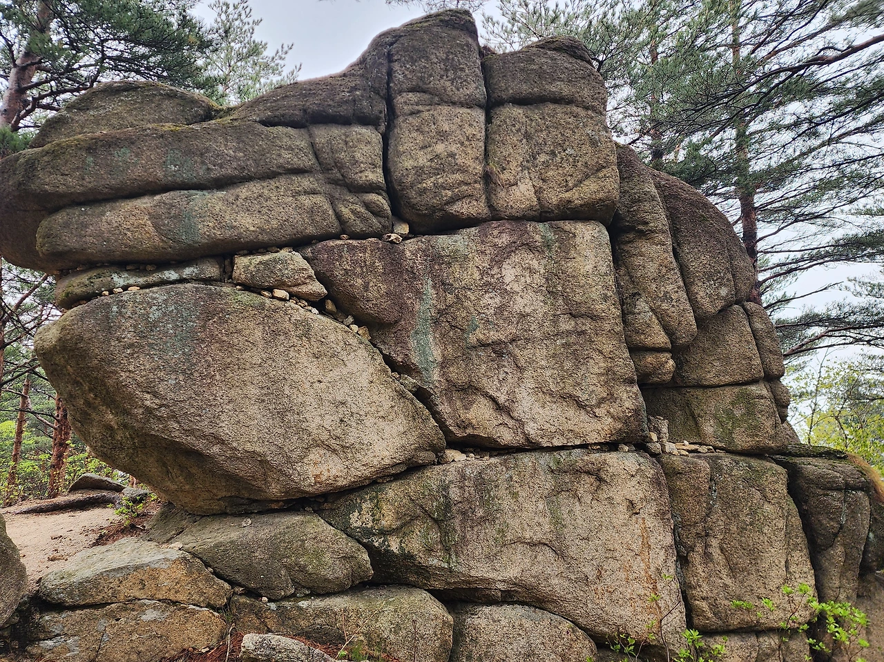 바위가 마치 시루떡처럼 차곡차곡 놓인 신기한 시루떡 바위를 지난다. 오르는 등산로 가로 연록 잎이 꽉 찬 숲이 마치 비밀 정원을 걷는 느낌이다.