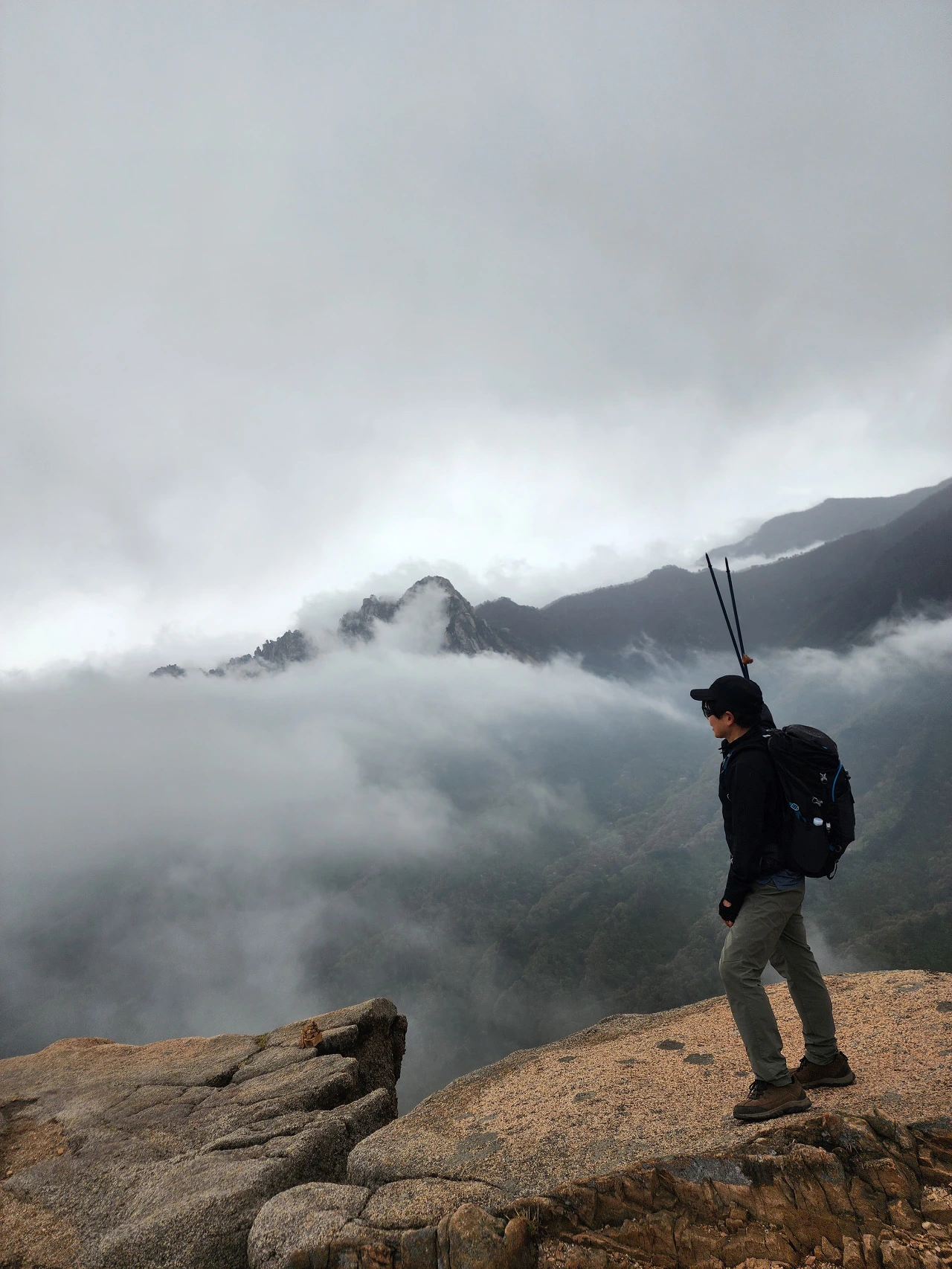 아! 카메라 앞에 절벽에 서는 순간 더 실감 나게 다시 볼 수 없는 환상적인 장면이 펼쳐진다. 발아래 구름이 계곡을 휘감고 울산바위와 설악산 봉우리들이 장대한 신비를 드러낸다. 멀끔한 모습을 바라봤다면 이만큼 설레고 신기하고 가슴 벅차지 않았을 것이다. 그것은 두말할 필요도 없는 자연이 베푼 최고의 향연이었다.
