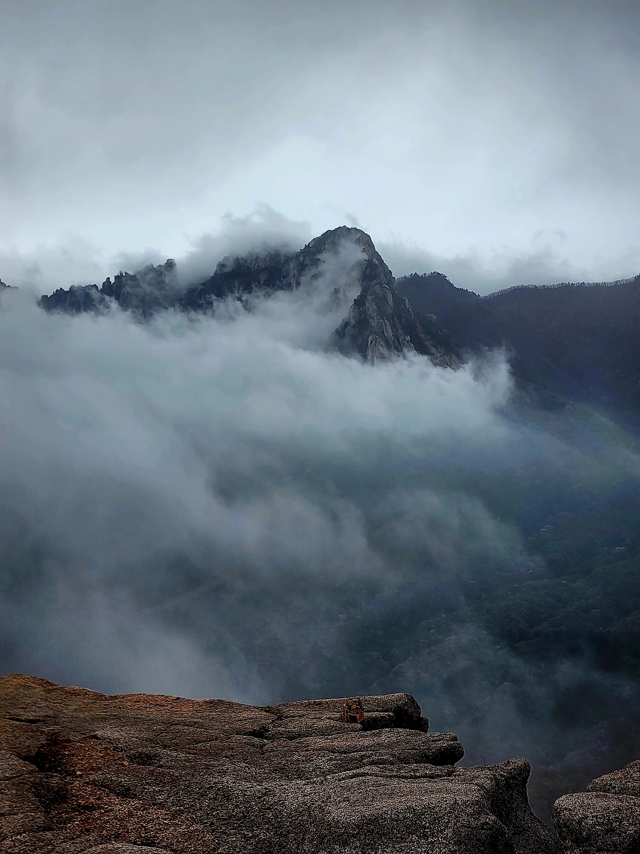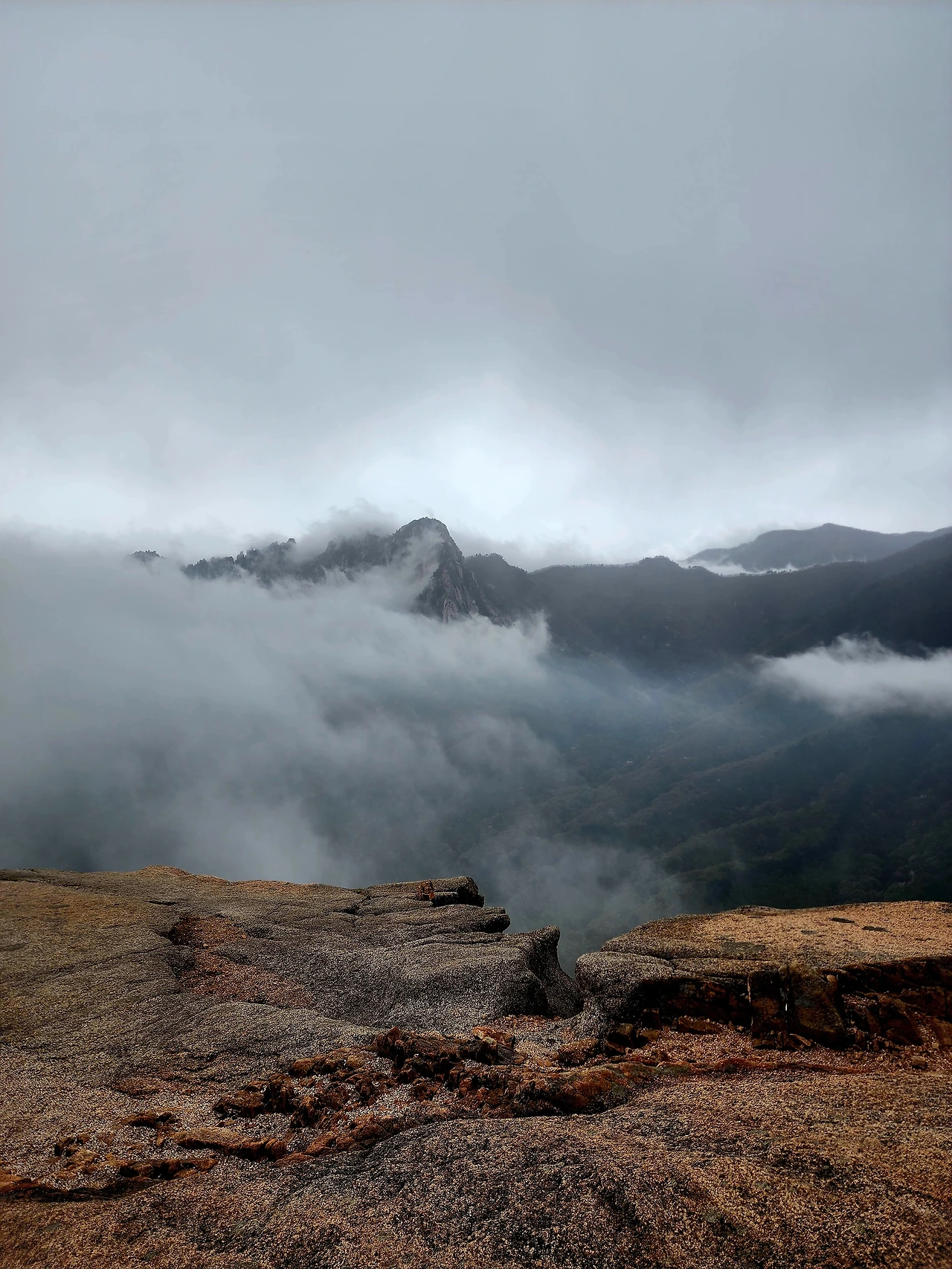 비가 오기 시작하면서 일말의 희망도 접었는데, 전혀 예상치도 못한 채 비 오는 신선대에 섰는데, 아! 그 순간 눈앞에 기적 같은 일이 벌어지고 있다. 운무가 산을 내려오면서 강물처럼 미시령 계곡을 흐르고 울산바위 꼭대기가 열리기 시작한다. 아무 기대 없던 순간에 가장 위대한 자연의 조화와 맞닥뜨렸다.