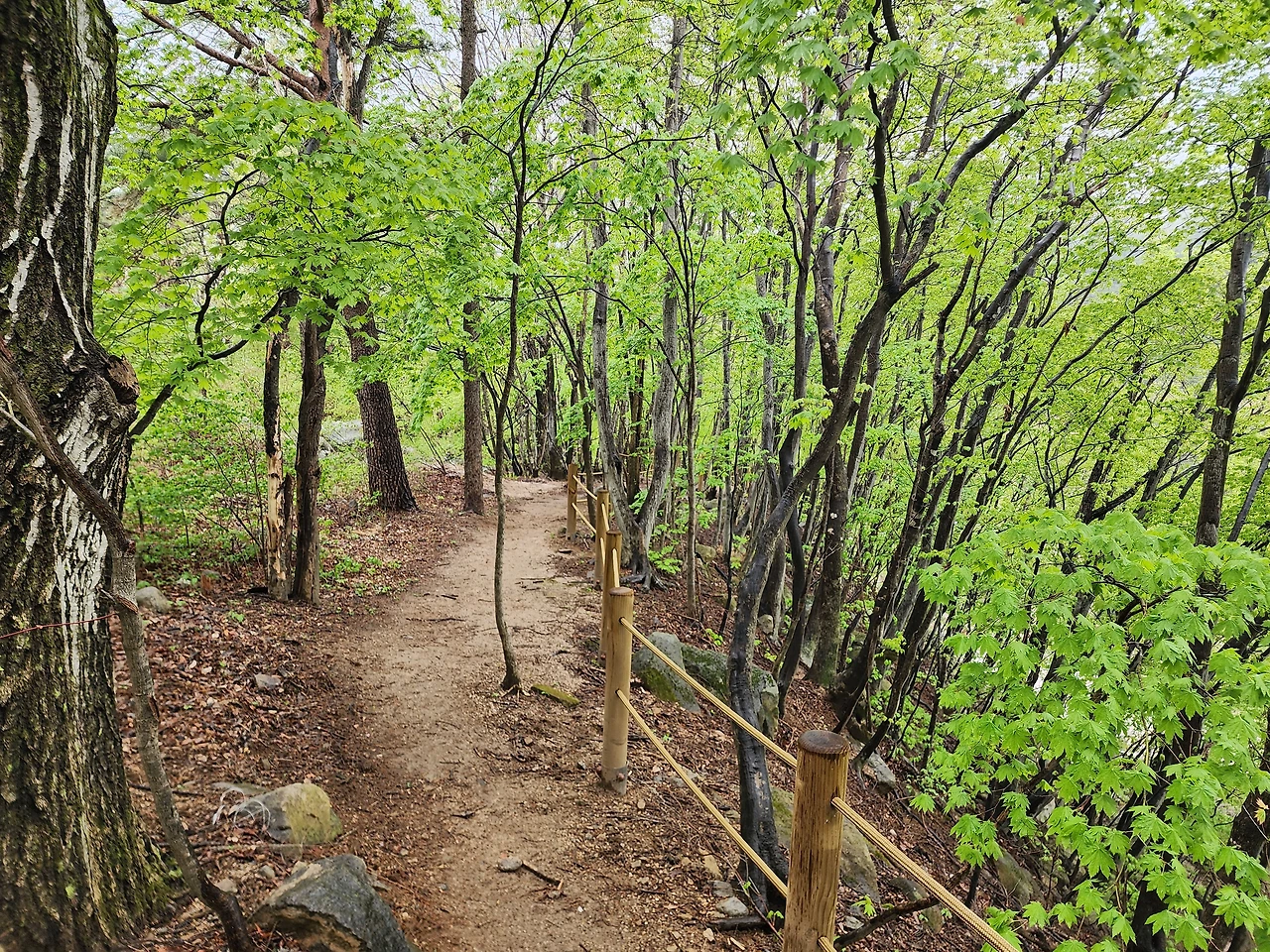 수바위 들머리로 내려섰다. 아래 쪽 산책로로 들어서서 신록의 숲길을 호젓하게 걷는다. 아무도 없는 숲 속 길에서 금강산 제1봉 신선봉에서 흘러내린 청정 계곡물소리만 하염없이 마음을 두드린다. 색이 너무 예뻐 투명한 빛을 내는 신록은 이미 내 마음 가득 스며들었다.