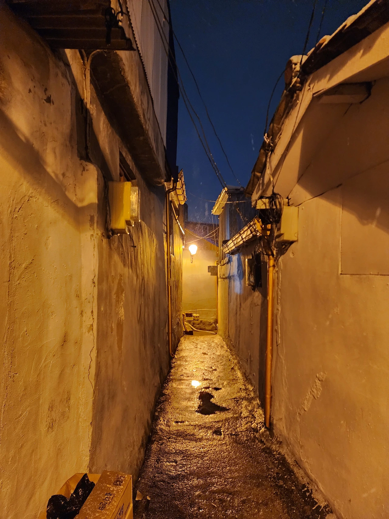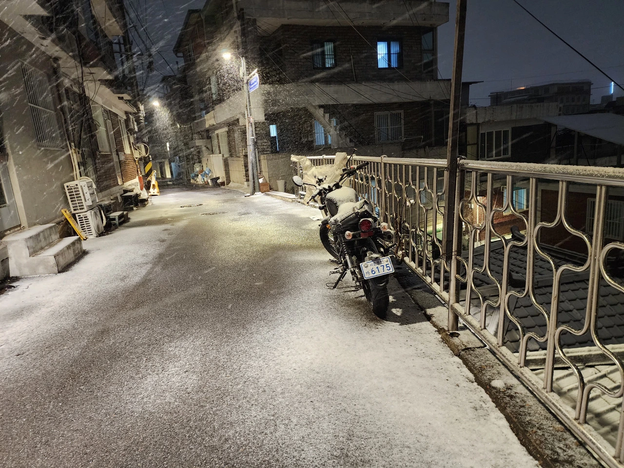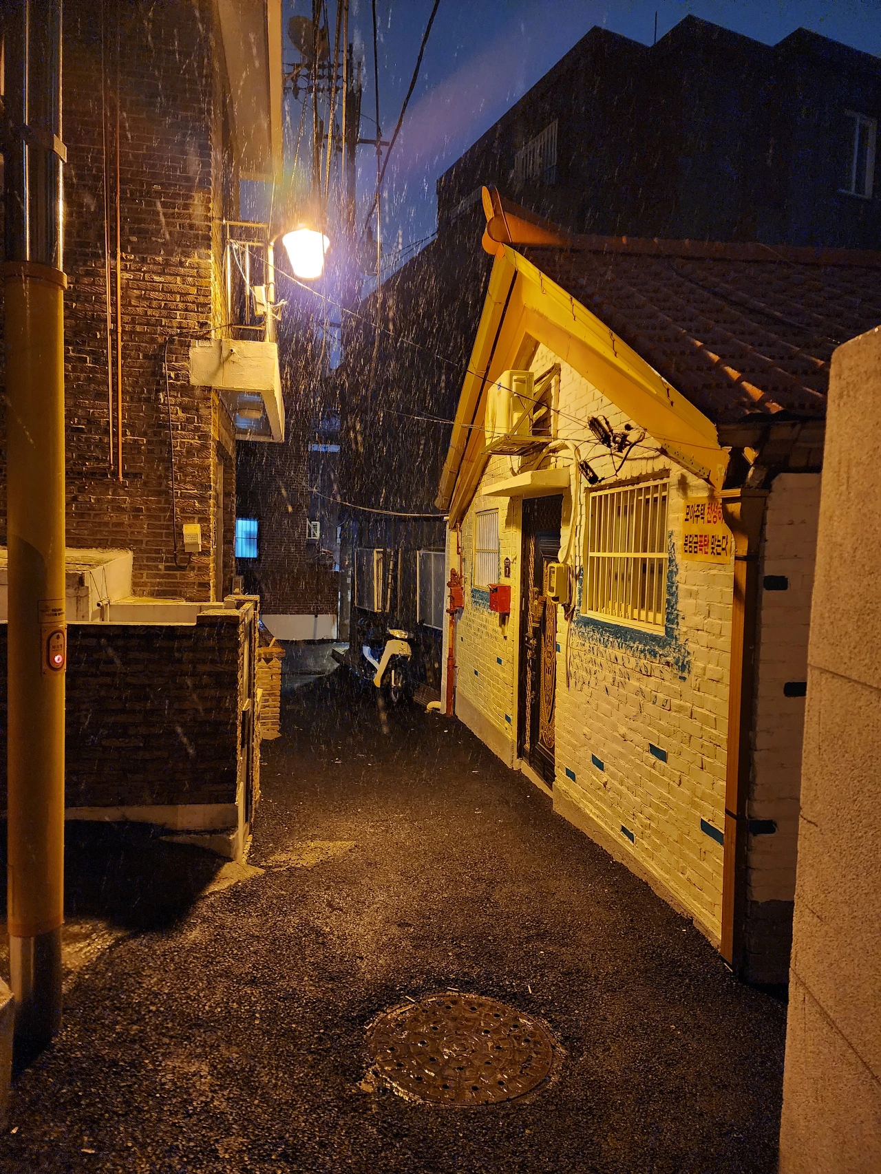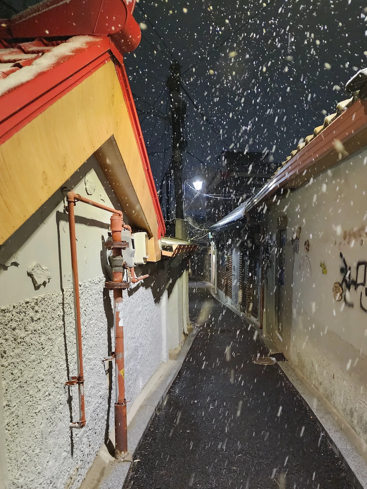 난간에 메어놓은 자전거 위로 눈이 소복이 쌓이는 풍경이 따뜻하다. 담 옆에 놓아둔 화분들, 고무다라들, 자투리 공간에 심은 나무, 단차를 극복하기 위해 놓은 철계단, 낮은 기와지붕 위에 소복이 쌓인 눈, 예쁘게 꾸민 가게 창문, 좁은 골목일수록 환히 불 밝힌 가로등, 가로등 불빛에 반사된 하얀 눈발들의 향연, 이 모두가 마냥 따뜻함을 주었다. 어디서 이런 풍경을 또 볼 수 있을까.