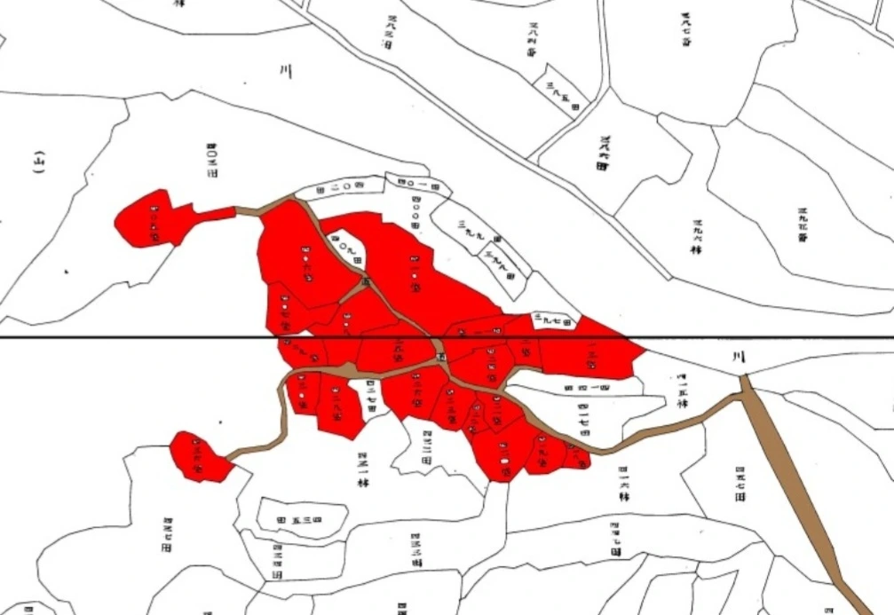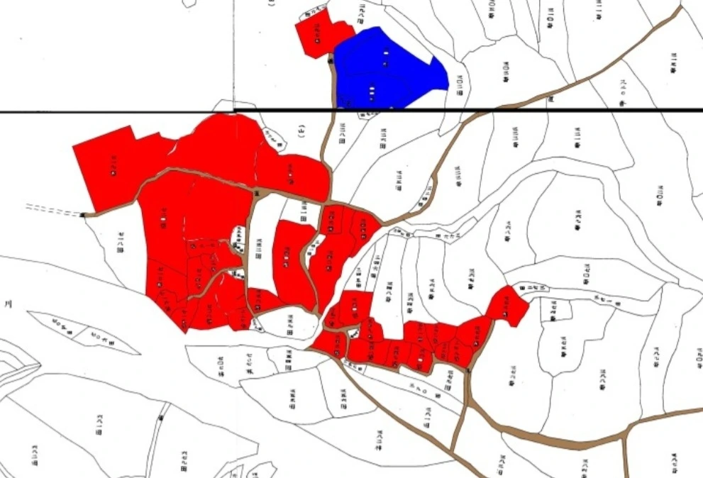 큰말의 100년 전 옛길(좌:1912년 지적도)이 지금도 그대로 남아 있다.(우)