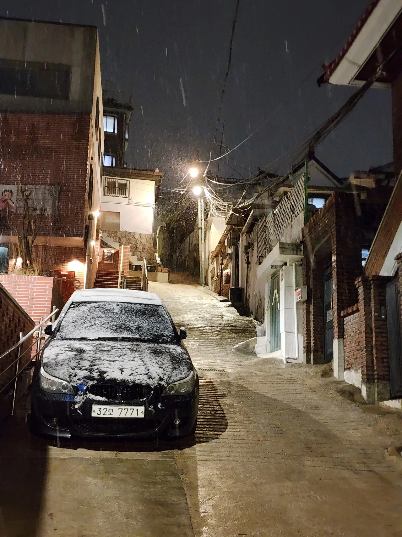 산자락 마을 삼양동은 북한산과 하나인 듯 자연스럽게 연결돼 있다. 눈이 펑펑 나리는 저녁에 자연으로 행하지 않을 수 없다. 자연은 거짓이 없다. 눈 내리면 내리는 대로 눈이 쌓인 모습을 그대로 정직하게 품어준다. 어느새 길과 나무와 온 세상이 하얀 눈 속에 파묻혔다.