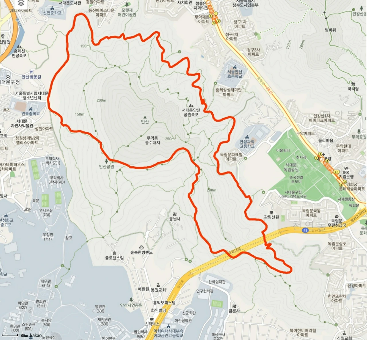 2. 인왕산 둘레길, 백련산 초록숲길 : 몇 년 전 무악재역과 독립문역 중간(무악재 고개)에 안산과 인왕산을 연결하는 '무악재 하늘다리'가 설치돼 인왕산 연계 걷기가 가능하다. 불쪽 방향으로 인근 백련산 초록숲길과 안산, 인왕산, 북악산과 북한산 등까지 녹색길 걷기의 무한 확장이 가능하다. 이외 서대문 자연사박물관 방향으로 내려와 안산도시자연공원과 궁동공원으로 이어 걷기도 가능하다.