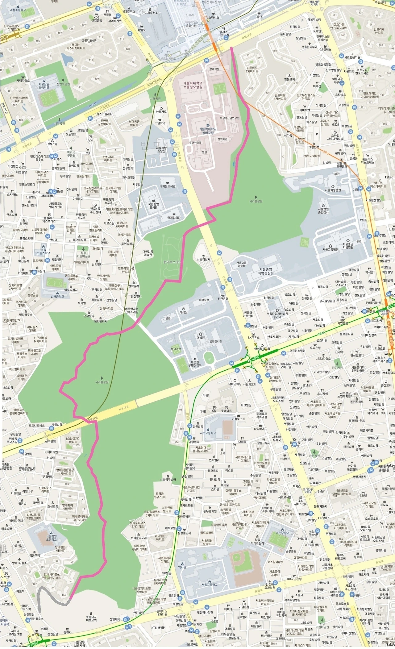 - 시간이 된다면 방배역 건너 매봉재산 숲길로 계속 이어 걸을 수 있다.(1.3km 연장)