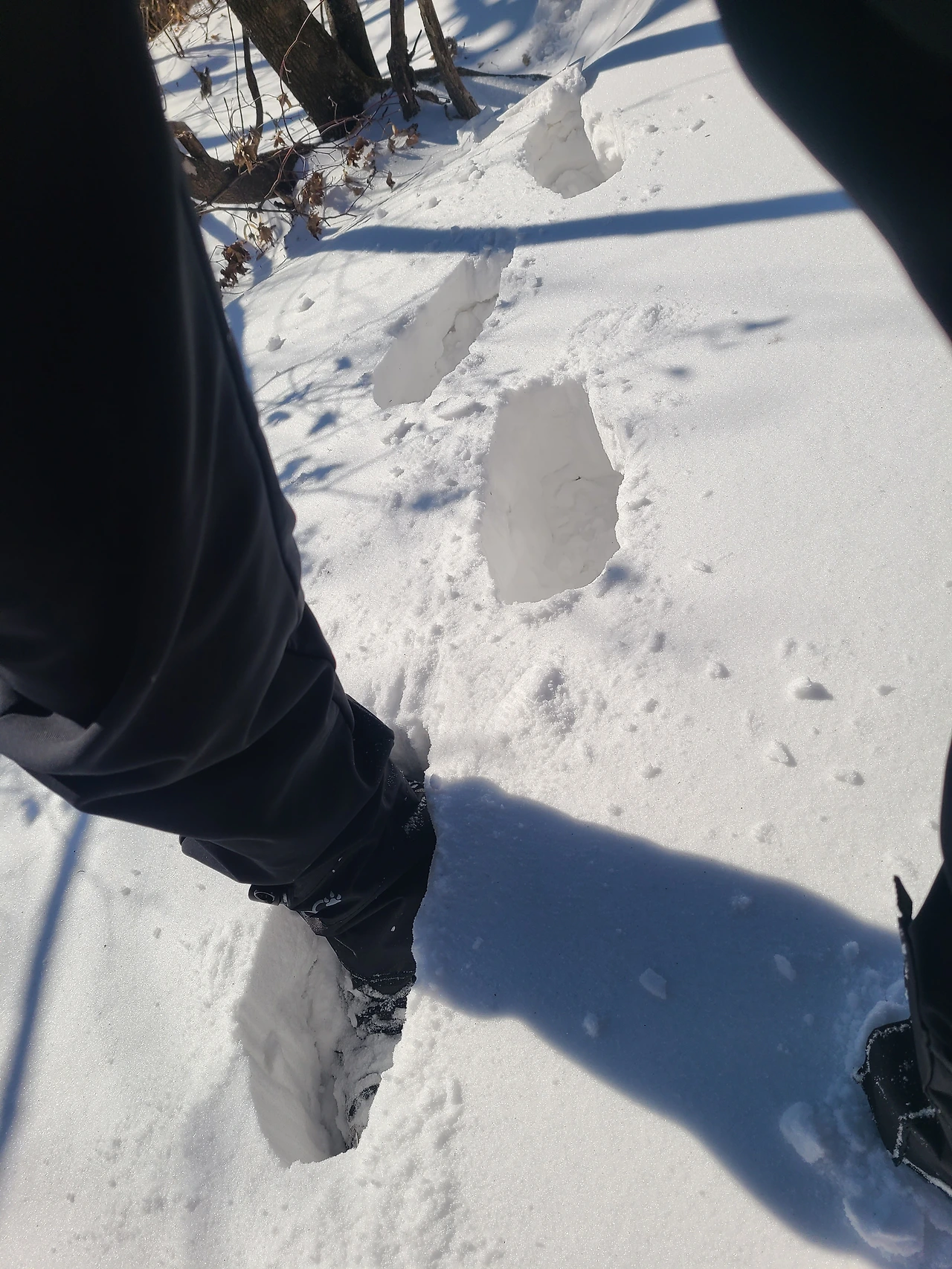 길은 없다. 푹푹 눈을 밟는 대로 20~30cm씩 꺼진다. 오르막에선 아이젠을 신었어도 미끄러지므로 발에 온 힘을 다 줘야 한다. 평소처럼 속도를 내지 못한다. 한참 온 것 같은데 보니 아직 5km 남짓밖에 못 왔다. 오늘 걸을 거리가 총 17.6km이니 온 것의 2배 이상 더 걸어야 한다. 그래도 한걸음 한걸음 내딛는다.