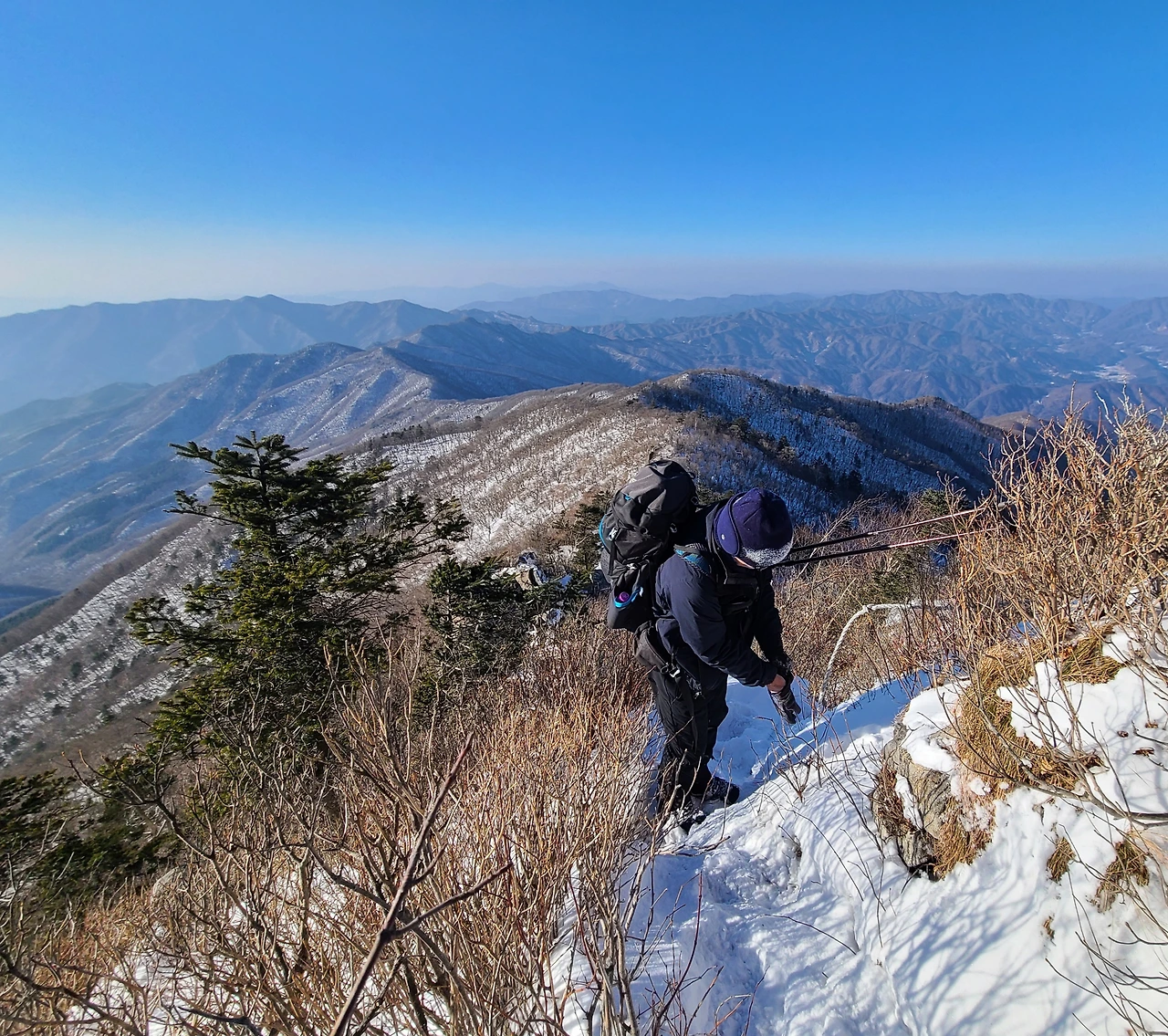 실은 지난주 가야산 때 바위 능선길에서 내 스틱이 부러지는 바람에 집에 있던 망가진 스틱을 가져온 게 패착이었다. 한쪽 스파이크 부분이 잘라져 힘을 못 받는데 너무 힘을 줘서 삐끗 미끄러지며 내가 절벽 쪽으로 1자로 넘어가는 순간 얼어 있던 성한 스틱이 내 몸에 부딪혀 두 동강으로 부스러지고 덕분에 나는 바로 앞에 바위에 떨어졌다. 구사일생이다. 천만다행으로 앞에 돌출된 바위가 있었던 것이다. 나는 살았지만 이젠 망가진 스틱 하나로 앞으로 남은 먼 길을 가야 한다.