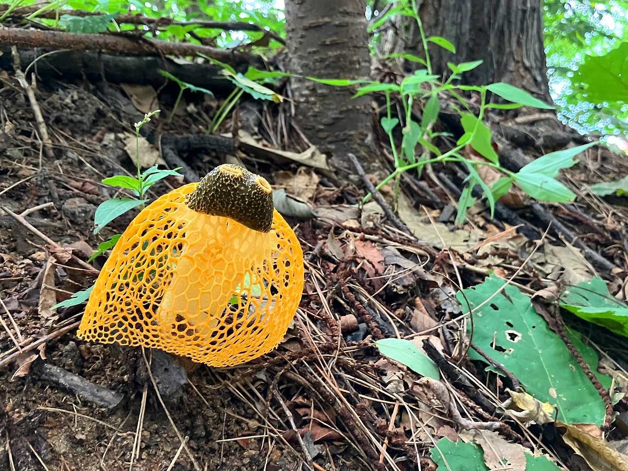 일반적으로 노랑망태버섯은 머리 갓에 구멍이 하나뿐인데 이 친구는 특이하게도 입을 두 개나 달고 있네요. 자세히 보니 몸통도 둘인 것 같군요. 그러면 쌍둥이 신부일까요? 대체 누가 데려가는 걸까요?(부럽고)