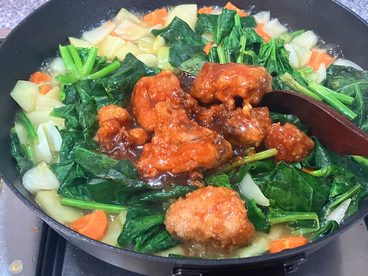 (1) 카레나 만들 요량으로 당장 먹고 싶거나 호딱 먹어치워야만 하는 채소들을 준비합니다(나는 시듬직한 시금치와 청양고추를 더했습니다). (2) 그리고 쓸데없는 에너지 소비를 줄이기 위해 내 몸을 조금 더 움직입니다. (3) 그래봐야 앞선 내용물들을 알려진 것보다 좀 더 여러 번(납작하게) 썰어주는 것뿐입니다. (4) 채소를 볶다가 남은 양념치킨을 넣고 양념이 골고루 나눠질 수 있도록 전체가 물에 잠기도록 합니다(홍수재해는 아닙니다만 만약 그렇다면 나무주걱이 방주가 될 수도 있습니다, 주인은 누구이겠습니까, 어디로 향하겠습니까).