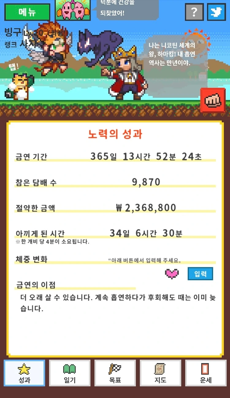 갈 길이 멀도다 허혈성 심장질환의 위험이 35% 감소한다고 알려진 신의 나무에 이름을 새기려면 앞으로 1년, 그다음 정화의 제단에서 세례를 받고 폐암의 위험으로부터 안전해지려면 5년, 끝내 비흡연자와 동등해지는 무지개의 고성에 이르기까지는 자그마치 10년이라는 세월이 필요하다네. 위안이라면 앞으로 남은 9년은 그간 마녀의 집까지 오는 1년의 여정(사투) 보다 길이길이 훨훨 짧다는 거라네.