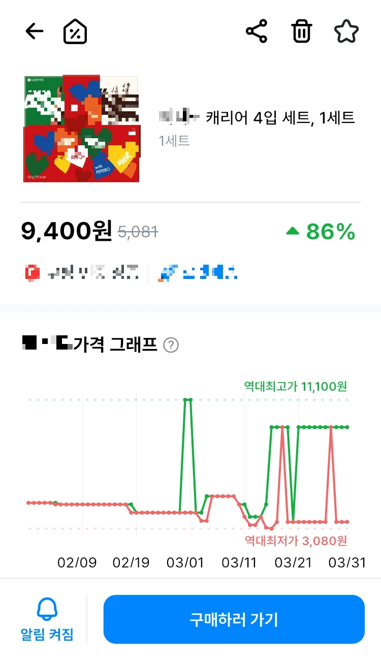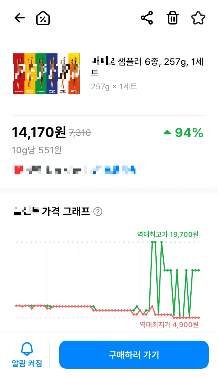오늘의 빼빼로 샘플러 6종 1세트의 시세는 14,170원(▲94%). 역대최저가는 4,900원, 최고가는 19,700원이다. 지나가는 아무개에게 이 그래프를 레버리지나 코인 차트라 내보여도 그런가 보다 할 것.