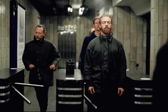 개찰구 장면. 오직 톰 옹만 쉽사리 통과하지 못한다.