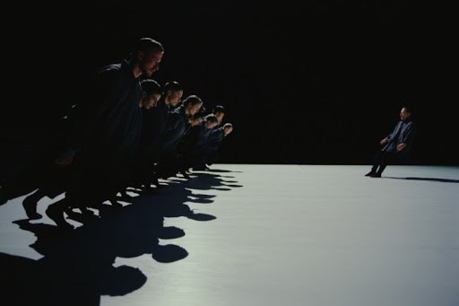 아니마(2019)는 15분짜리 단편 영화, 혹은 뮤직비디오라고 생각하시면 편합니다. 영상은 땅 속을 달리는 지하철에서 시작됩니다. 꾸벅꾸벅 잠에 든 승객들이 보이고, 그 와중에 슬며시 잠에서 깨는 톰 요크 옹과 한 여인이 보입니다. 둘의 눈이 마주치는 순간 승객들의 군무가 시작됩니다. 잠에 빠져 일사불란하게 뒤척이는 듯한 군무입니다. 지하철이 멈추고, 승객들은 썰물처럼 빠져나갑니다. 그 때 톰 옹의 눈에, 아까 그 여인이 두고 내린 가방이 하나 보이죠. 톰 옹은 그 가방을 전해주기 위해 승객의 인파 속으로 뛰어듭니다. 그 와중에 그 인파 속에서 눈을 뜨고 있는 사람은 여인과 톰 옹 뿐입니다. 톰 옹은 개찰구에서 막히기도 하고, 거꾸로 밀려 오는 눈 감은 자들의 방해를 받으면서도 기어이 지상으로 올라와 그 여인과 만납니다. 둘은 지상의 밤거리를 함께 달리고, 춤을 춥니다. 곧 낮이 오고, 둘은 지상의 트램에 함께 올라타며 영화는 끝납니다.