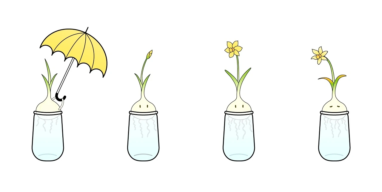 땡땡씨는 엄마가 새벽에 챙겨준 작은 보자기를 손에 쥐고, 지친 몸을 이끌며 집으로 들어왔다. 집에 와 긴장이 풀리니 이제서야 배가 고파져 뭐라도 먹고 싶어졌다. 매일 배달 음식으로 끼니를 때우다 보니 엄마에게 받아온 음식들이 종종 상했던 만큼, 이번만큼은 엄마가 챙겨준 음식을 먹어볼까 하는 마음으로 보자기를 풀어보았다. “어? 이게 뭐지.. 먹을 수 있는 건가? 양파라기엔 싹이 너무 자랐는데.” 엄마한테 전화해서 물어볼까 머뭇거리던 찰나에, 땡땡씨는 엄마가 했던 “뭐라도 돌볼 줄 알아야해”라는 말이 떠올랐다. 이 정체도 모르는 식물을 당연히 키울 생각은 없었지만 뭔지는 궁금했기 때문에, 사진을 찍어 검색해보곤 수선화라는 걸 알게 되었다.