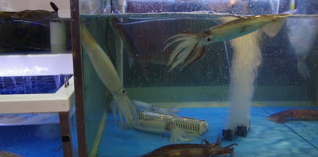 횟집 밖 수조, 오징어 서너 마리가 빠져있다