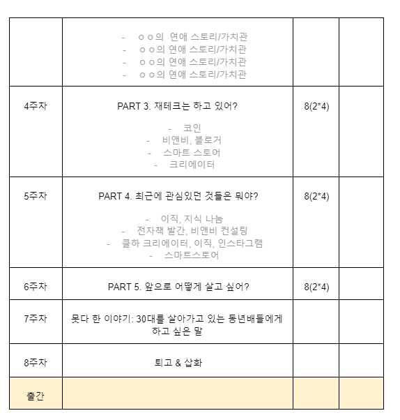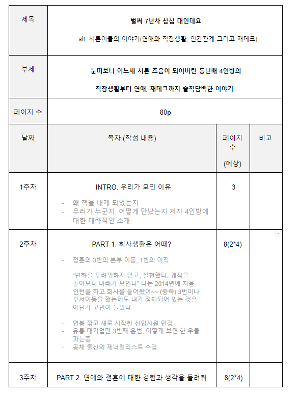 다음엔 지금처럼 각자 조사해서 발표하는 형식 대신 협업해서 하나의 결과물을 내는 프로젝트를 진행하기로 했다. 내가 다른 공유모임에서 배워온 <전자책 발간하기>을 커살프 모임에 적용했다.