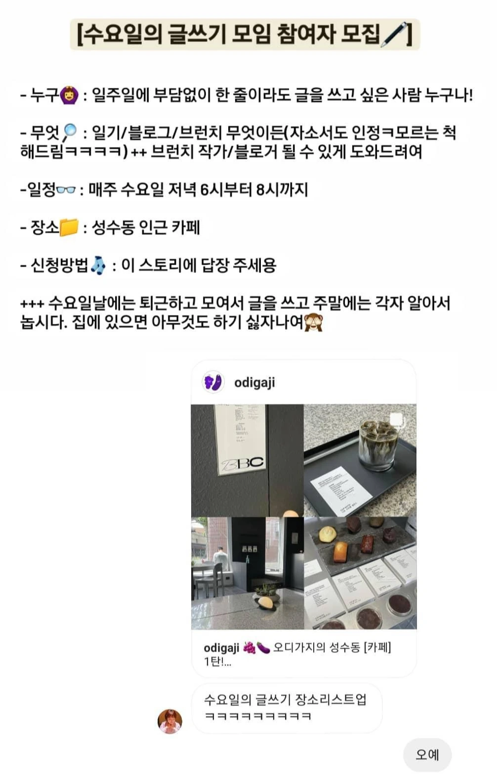 꼭 회사 동료가 아니더라도 수요일 저녁에 성수동에 올 수 있는 사람이라면 모두 받아들이려고 하였으나.. 신청 DM은 오지 않았다.^^;