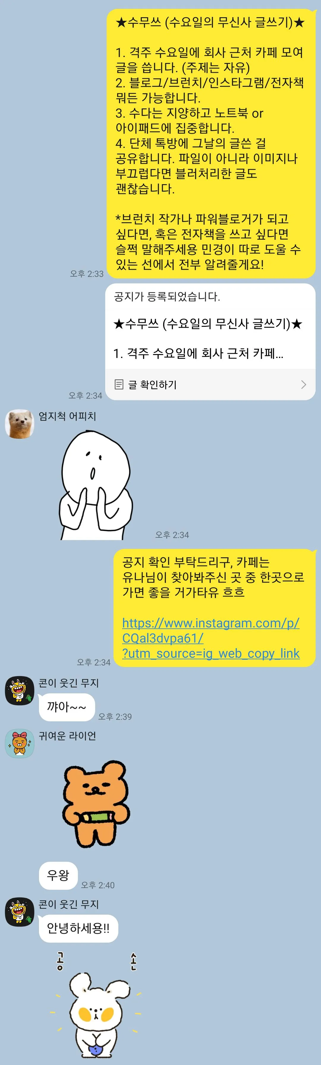 기존 계획 상으로는 격주 수요일마다 회사 근처 카페에 모여서 조용히 글 쓰고 해산하고자 하였으나, 갑작스레 격상된 코로나 4단계로 재택근무가 시작되었다. 그래서 각자 글을 쓰고 인증하는 형태로 진행하기로 했다.
