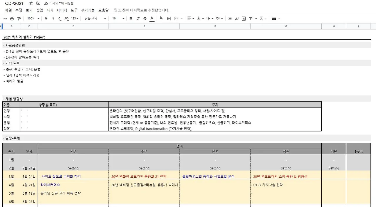 킥오프 후에 진행된 첫 모임은 예상대로 순조로웠고, 기대보다 재미있었다. 두 멤버는 본인 직무와 관련된 주제를 준비해서 공유해주었는데, 특히 '국내 백화점 시장의 매출 추이와 대표 지점의 특징, 향후 전망'은 평소 내가 알 수 없었던 정보라 특히 흥미로웠다. 왜 롯데가 롯데 중인지 알겠던..!