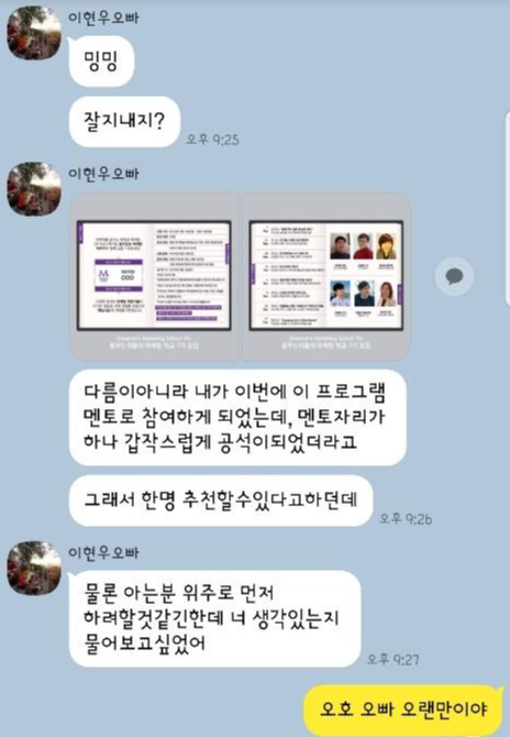 바야흐로 6년 전 대학교 3학년 때 나의 미약한 스펙을 조금이나마 채워보고자 참여했던 공모전 모임으로 인연이 된 현우 오빠에게 연락이 왔다.