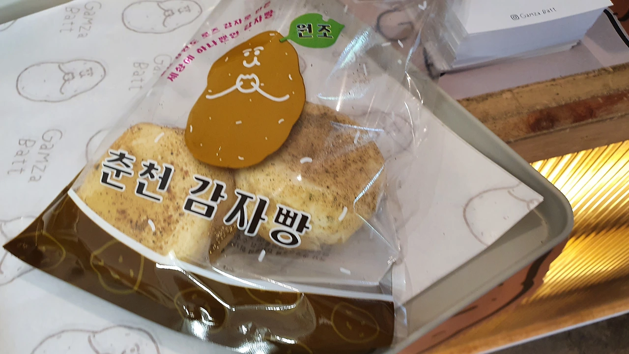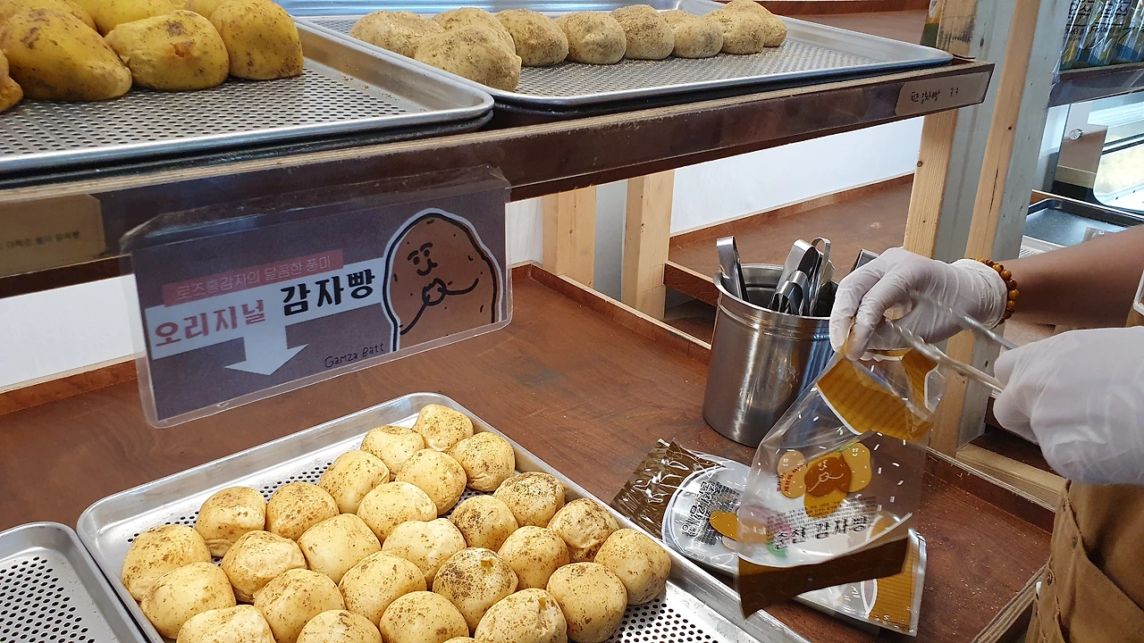 감자 캐릭터가 귀엽게 그려져 있는 감자빵 판매대