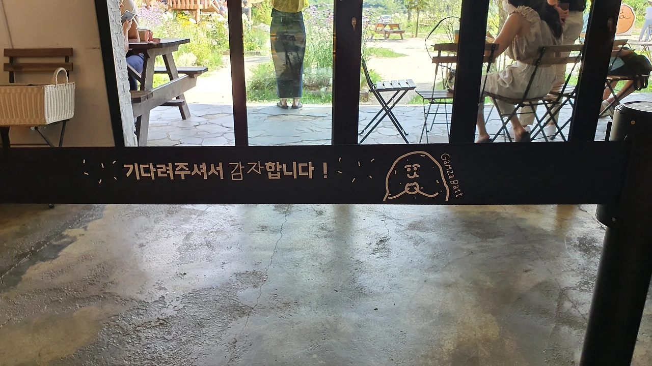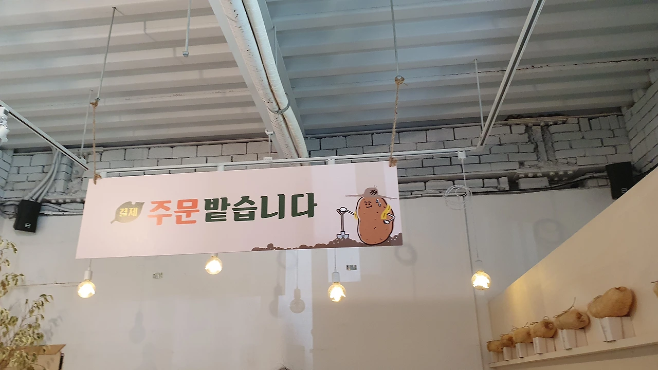 저 귀여운 '감자'손글씨와 공손한 감자 캐릭터는 긴 줄에도 고객들을 미소를 짓게 한다.