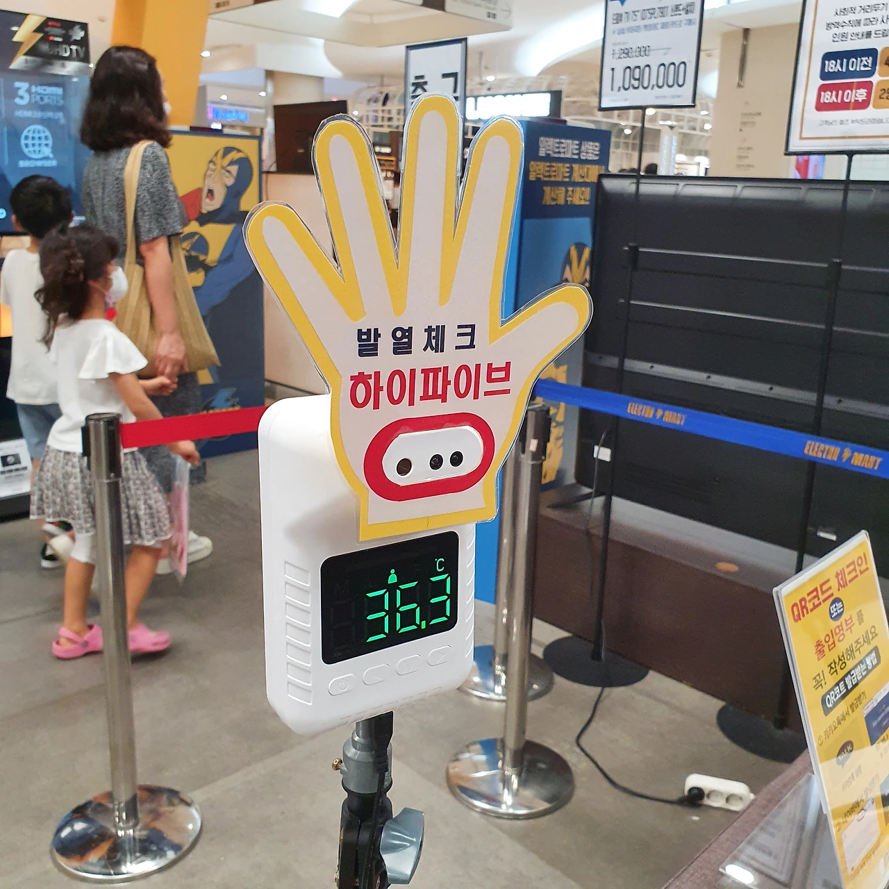 타임스퀘어에서는 입장객 대상으로 다른 곳들처럼 QR코드로 출입을 인증하고 체온을 체크한다. 하지만 딱딱하게 '손목을 가져다대주세요'라고 요구하지 않는다. 대신 '고객님. 하이파이브 한 번 해주세요'라고 제안한다.