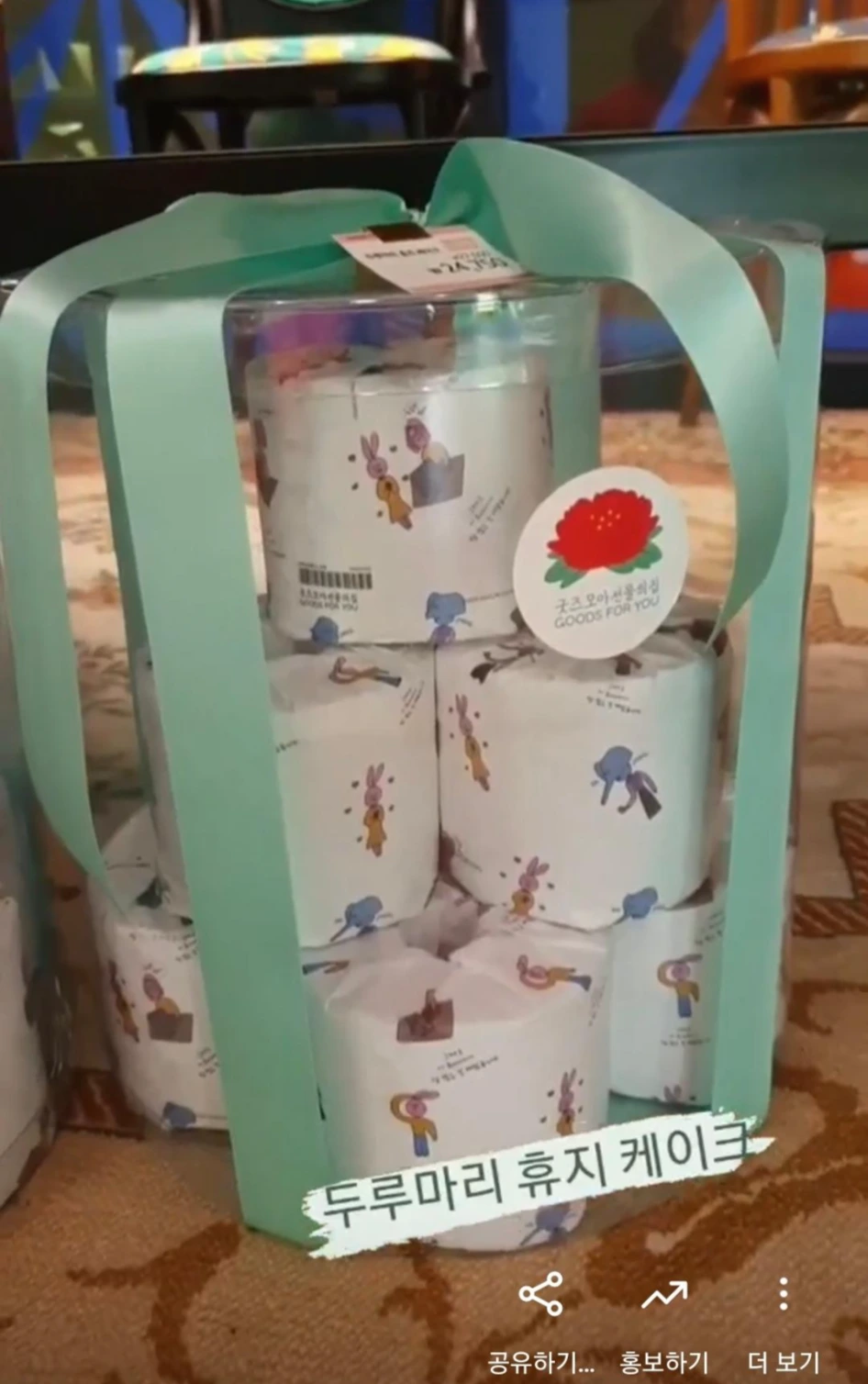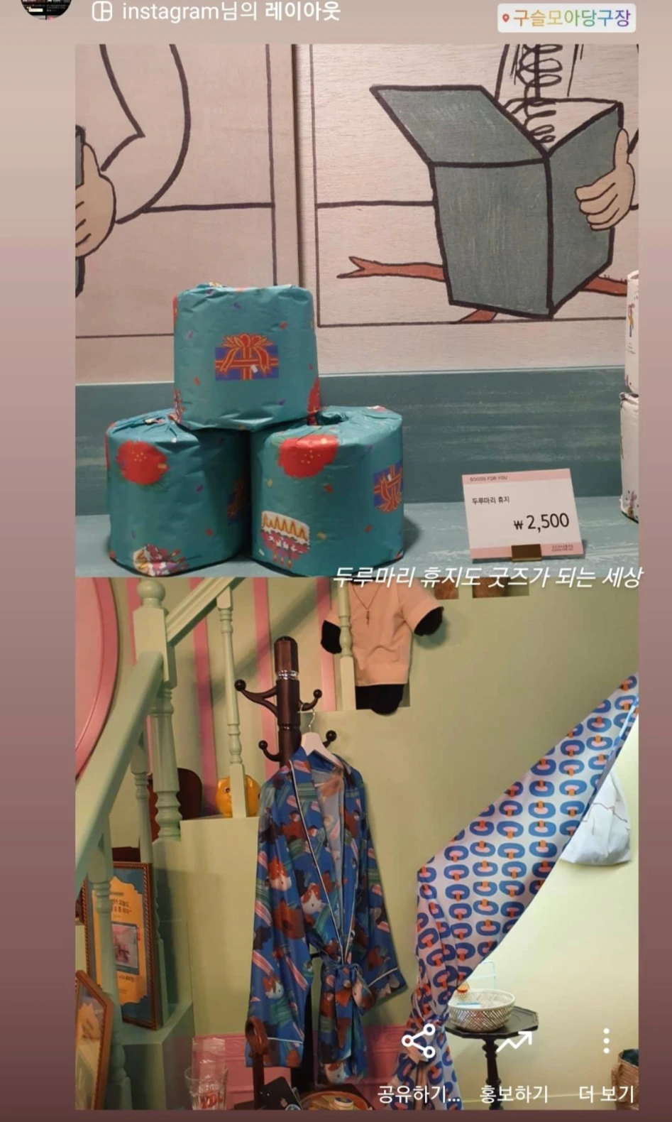 대림미술관 재단에서 운영하는 굿즈 마켓, 구슬모아 당구장에 방문했더니 두루마리 휴지를 예쁜 포장지에 싸고, 또 케이크처럼 포장해서 굿즈로 판매하고 있었다. 현재 쿠팡에서 30 롤에 10,280원(1 롤에 342원꼴)인 두루마리 휴지 하나에 예쁜 옷을 입으니 2,500원에 팔린다.