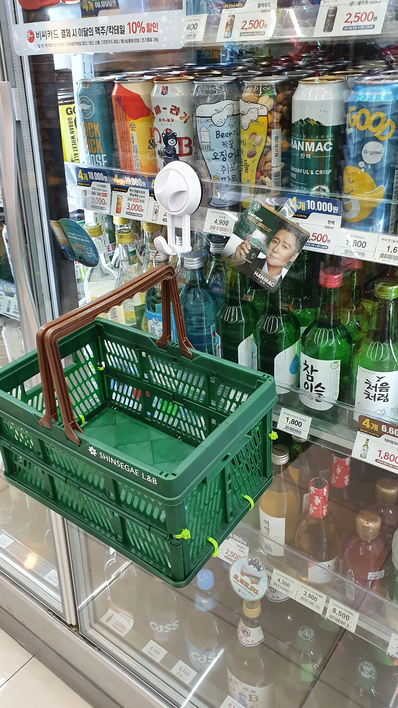 편의점에서 지나칠 수 없는 코너가 있다. 바로 만원에 맥주 4캔 이벤트다. 왜 항상 편의점에 입장할 때는 바구니가 보이지 않을까? 맥주를 담을 때면 양쪽 겨드랑이에 한 캔씩 끼고, 한껏 요상한 자세로 계산대까지 맥주를 안고 가곤 했는데, 음료 냉장고에 걸려있는 이 바구니를 보고는 무릎을 탁 쳤다.