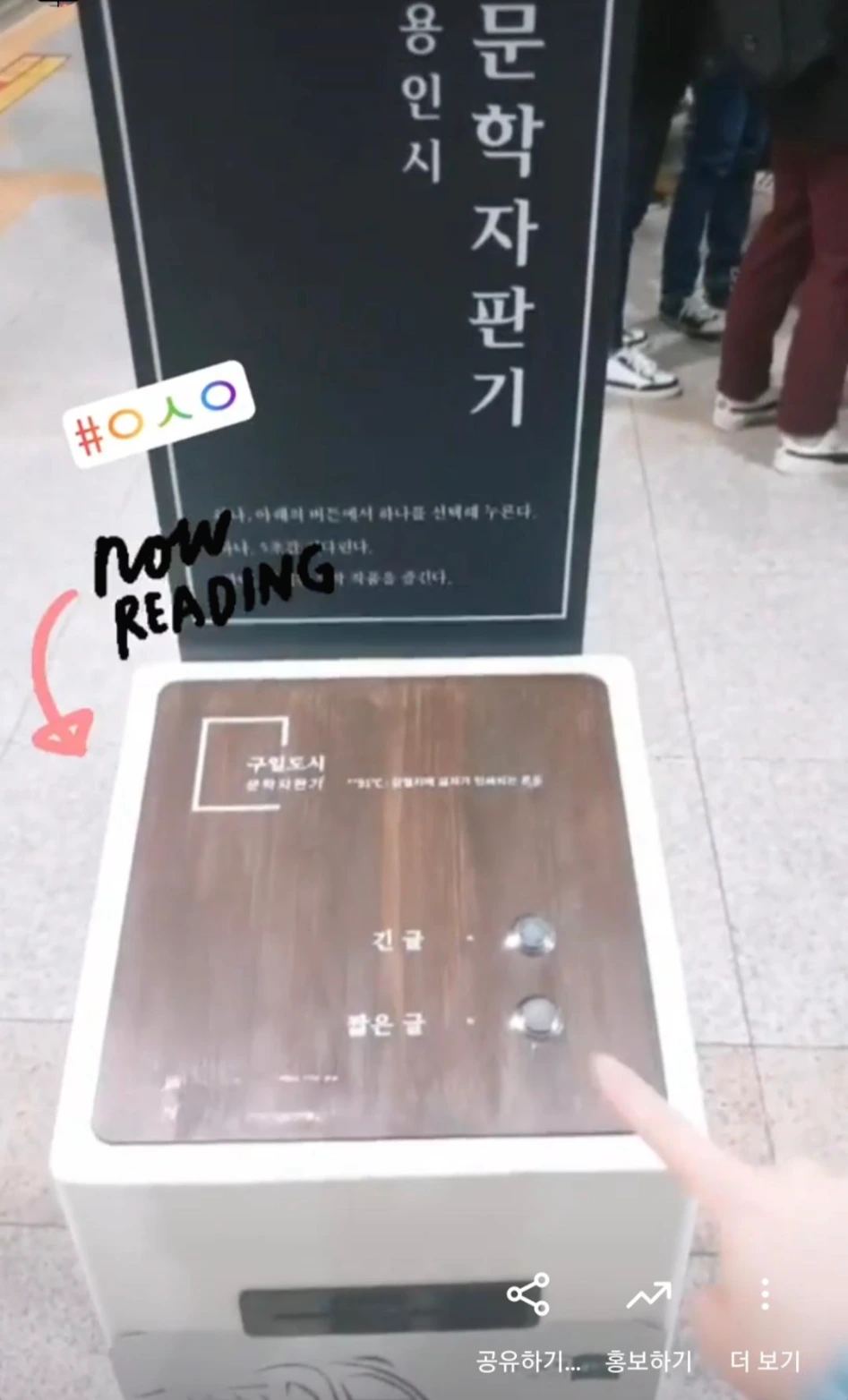 부모님이 서울에서는 꽤 거리가 있는 용인에 거주하시기 때문에 때때로 대중교통으로 부모님 댁에 방문하기 위해서는 먼 길을 가야만 한다. 어느 날 에버라인으로 환승하고 지하철을 타려고 하는데 용인시에서 운영하는 문학 자판기가 눈에 띄었다.