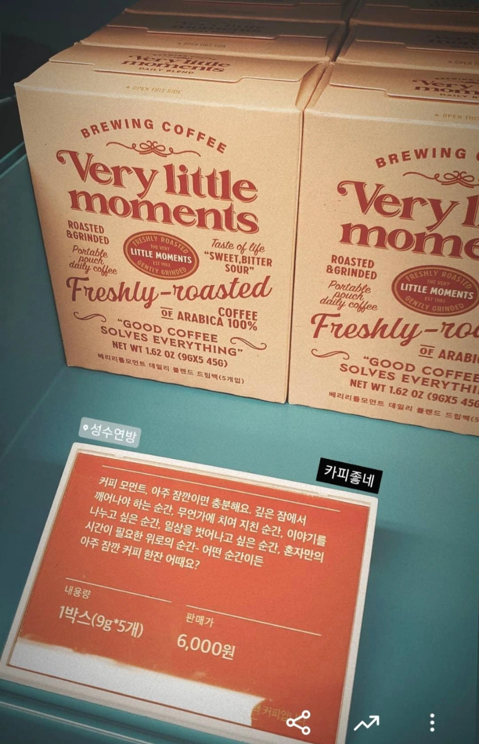 아라비카 커피 100%는 어딜 가든 살 수 있다. 하지만 같은 커피라도 성수연방 에디터의 문구를 곁들이면 매력이 N배 상승한다. 바쁜 사회인에게 '커피 모먼트, 아주 잠깐이면 충분하다'는 제안을 건네며 그 옆에서는 소비가 죄는 아니잖냐는 글귀를 보니 저절로 고개가 끄덕여진다.