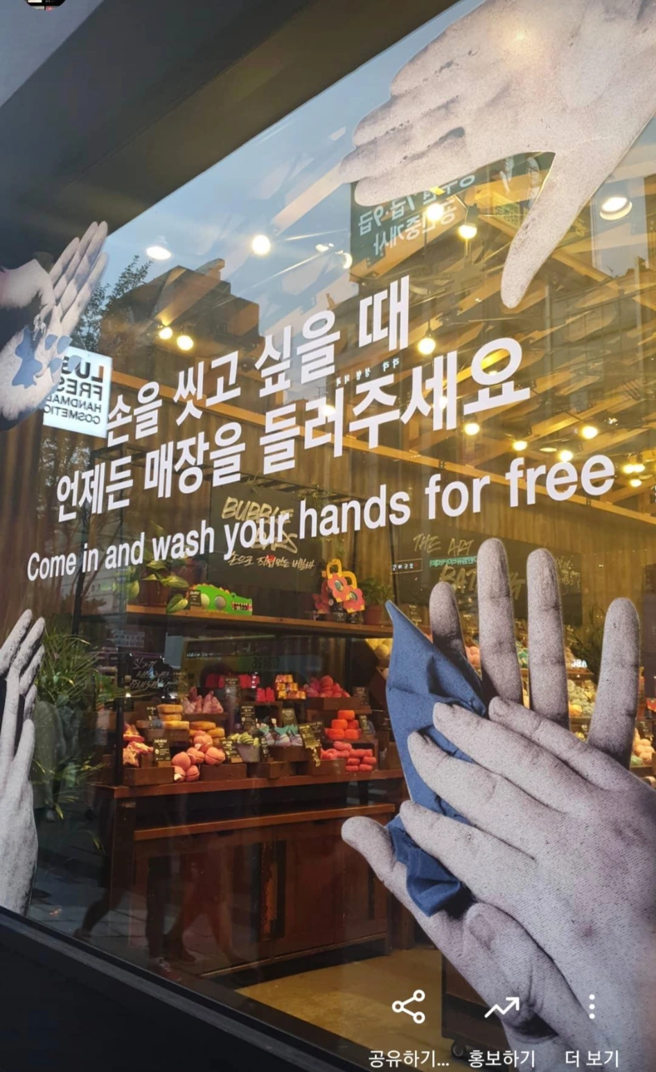 나도 실제로 이 문구를 보고 당당하게 러쉬 매장 안에 들어가 기분 좋은 비누 바로 손을 닦고 나왔다. 부담스러운 호객행위나 점원의 살가운 안내가 없어서 더 좋았다.