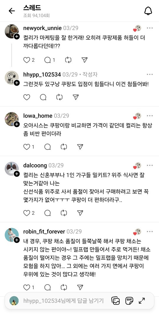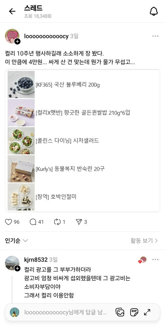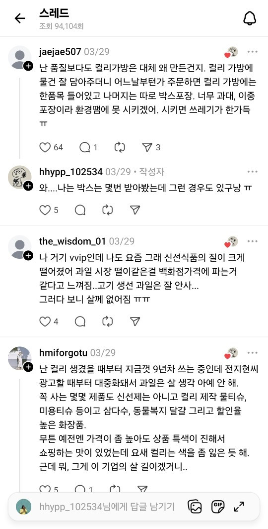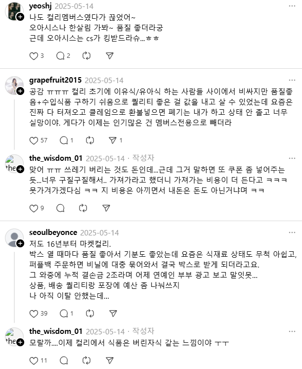 ++ 최근 스레드의 컬리 여론을 보면 과거에 비해 정육/수산 쪽 퀄리티가 많이 떨어졌다는 의견도 많이 있네요. 광고비가 엄청 비쌌을 텐데 이게 다 소비자 부담이라는 촌철살인의 댓글도 보여서 제가 다 움찔했습니다. 여러 의견을 캡처했으니 눌러서 확대해서 읽어보시길 추천합니다.