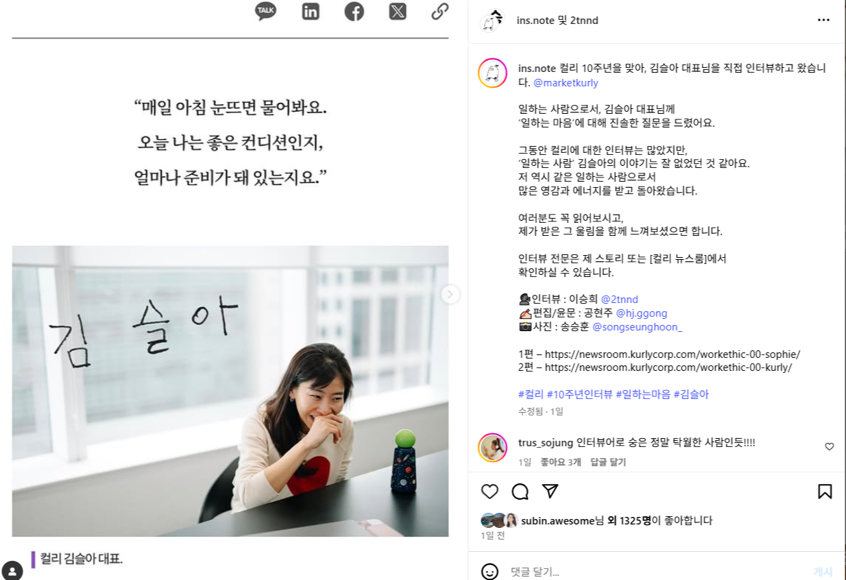 여기서 눈에 띄었던 점은 구 배민마케터로 업계에서 유명한 '마케터 숭'님이 컬리 뉴스룸과 협업해서 컬리 10주년 인터뷰를 직접 이슬아 대표님과 진행했다는 점입니다. 숭님이 운영하는 인스타그램 채널 2개(팔로워 10만,16만 채널)에 공동 게시로 포스팅한 인터뷰는 좋아요 1476개, 댓글 26건으로 좋은 반응을 얻었습니다.