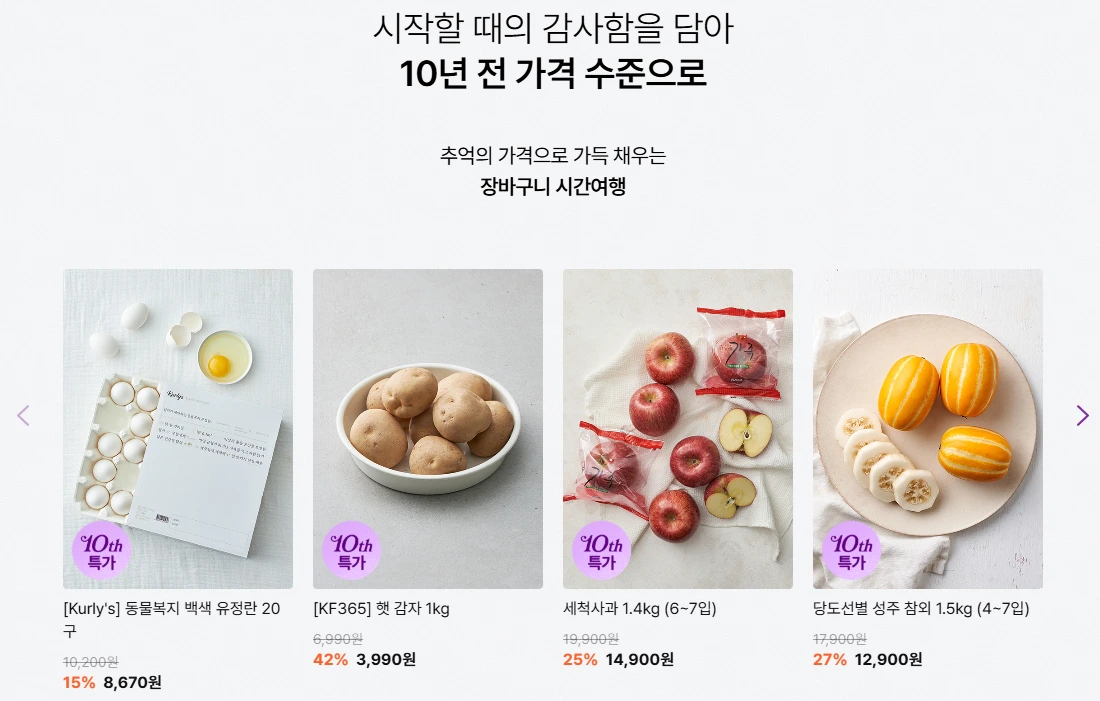 - 장바구니 시간 여행 : 장보기 대표 상품을 10년 전 가격으로 판매
