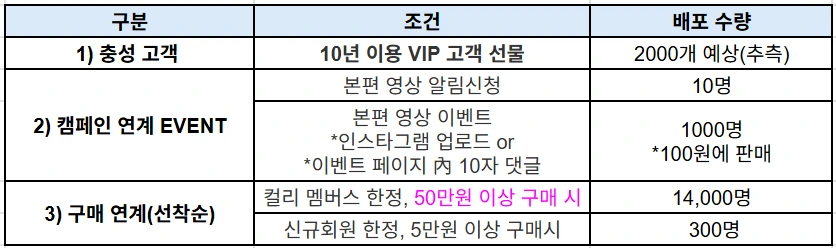또한 컬리멤버스 가입자이면서 50만원 이상 구매해야 하는 허들을 세팅한 점도 눈에 띄었습니다. 컬리에서 50만원 이상 구매해야 한다니, 3대가 함께 사는 대가족이 아닌 이상 쉽지 않을 것 같았거든요.