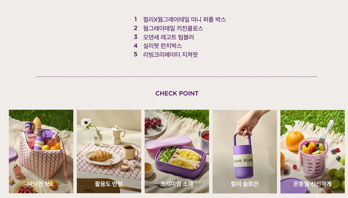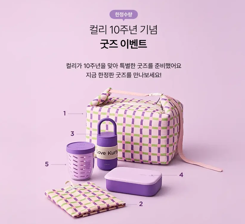 컬리 10주년 행사답게 여러 이벤트를 진행했고, 그중에서도 한정판 굿즈가 가장 주목도가 높았습니다. 총 15만원 상당의 한정판 굿즈는 인지도와 감도 모두 높은 5개 브랜드와 협업하여 소장하고 싶게 만들었습니다.