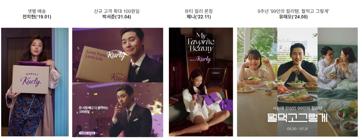 샛별 배송 전지현(‘19.01) → 신규 고객 확대 100원딜 박서준(‘21.04) → 뷰티 컬리 론칭 제니(‘22.11) → 9주년 '99인의 컬리템, 뭘 먹고 그렇게' 유태오(‘24.05) →10주년 '짧은 인생을 좋은 것으로' 이효리,이상순,이찬혁('25.05)
