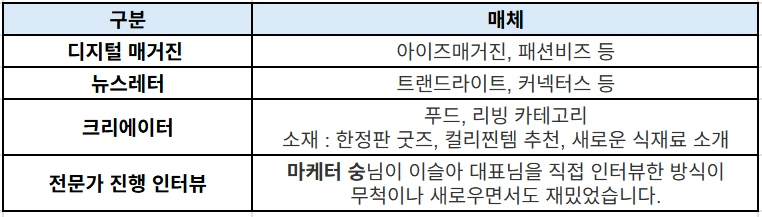 디지털매거진과 뉴스레터에서는 컬리의 흑자 전환과 네이버와의 제휴 등의 소재로 많이 보았고요. 크리에이터는 N번째 애정템이라던지, 꽈배기모양 스트링치즈같이 NEW 카테고리의 신상품을 소개하며 구매처로 컬리를 지목하는 식의 콘텐츠가 많았습니다. 물론 한정판 굿즈를 시딩 받은 광고 영상도 많았고요.