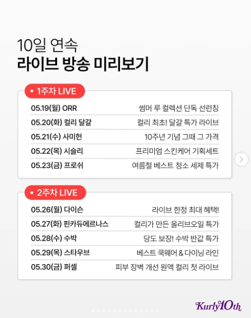 - 10개 브랜드 릴레이 라이브 방송 : 매일 저녁 8시 30분